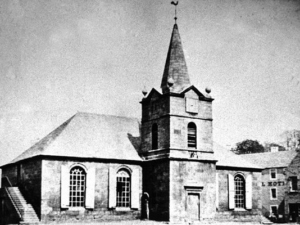 That building had an outside stair leading to a gallery, a belfry and steeple with weather cock. The ancient ‘Jougs’ for punishment were fastened to one gable end. The windows had wooden shutter to protect the glass from children playing handball against the walls. A bell cast in Rotterdam in 1697 now sits proudly in the vestibule of the present church. Previously on the same site there was a church dedicated to St Conval. In the days of the older parish churches the graveyard was around the church. It stopped being used about 1768 but burials were being carried out at the Gallows Hill in Barrhill which eventually became the old cemetery.
